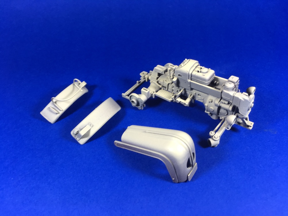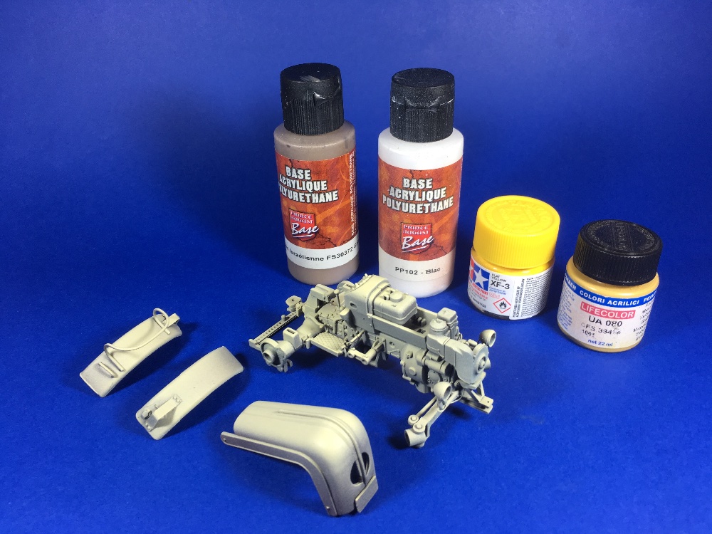 Ainsi préparé, l'ensemble des pièces reçoit une couche de peinture gris panzer et immédiatement, l'uniformisation de la teinte enlève le côté translucide et teinté dans la masse de certaines pièces. On gagne très vite en profondeur et en unité.