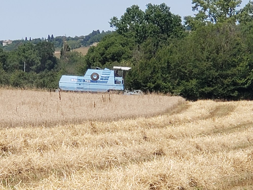 Blé dur bio moissonné par une ancienne très en forme dans la Drôme.