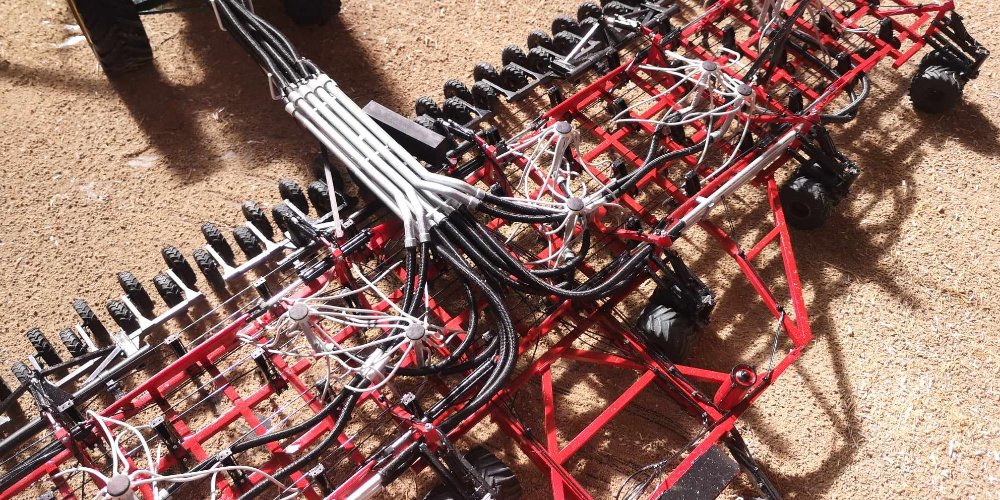 Il y a ensuite eut montage des verins de repliage, tuyaux de semances (élastique pour les gros et fil éléctrique de 1mm pour les petits) avec les tetes de distrib, Et un gros travail d'hydraulique avec la réplique à l'identique du réseau hydraulique de la bete :)