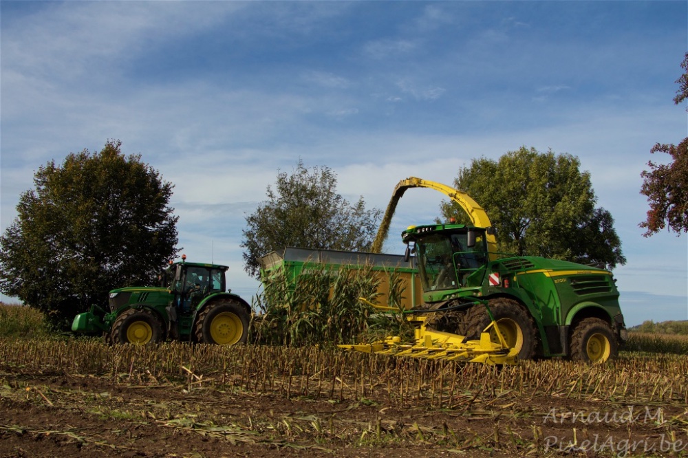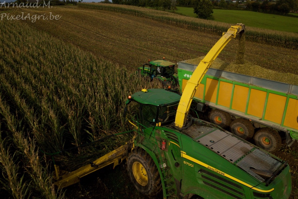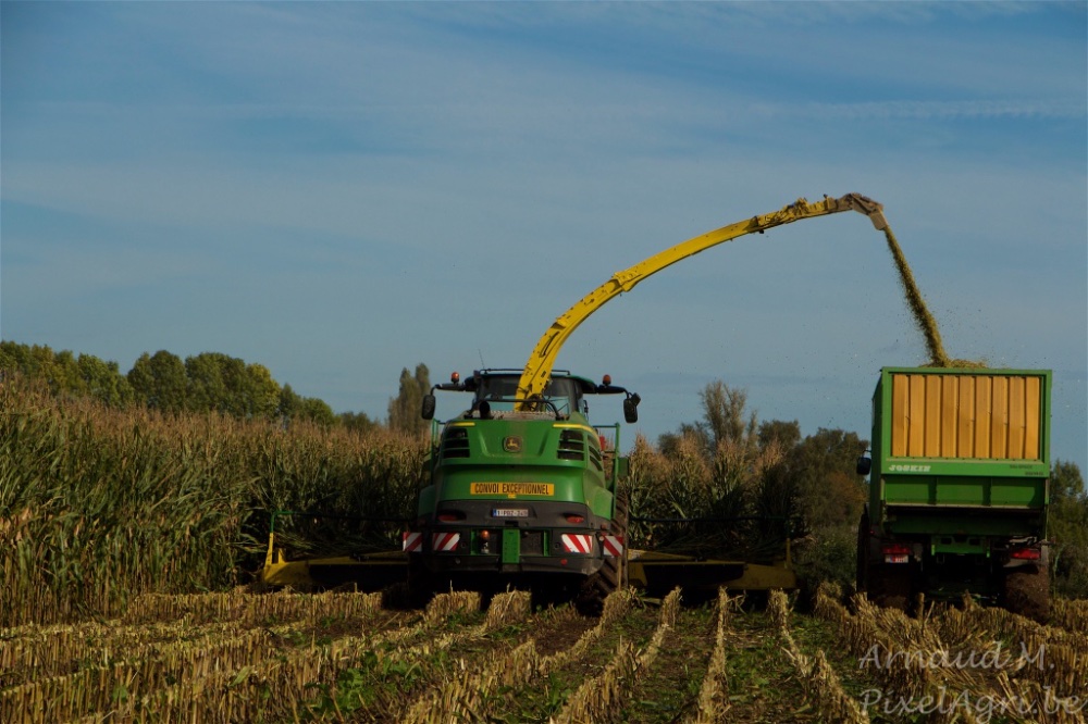 Durant le mois d'octobre, la plupart des maïs sont ensilés. Voici donc une ensileuse John Deere 8700i équipée d'un nouveau bec Kemper 390Plus.