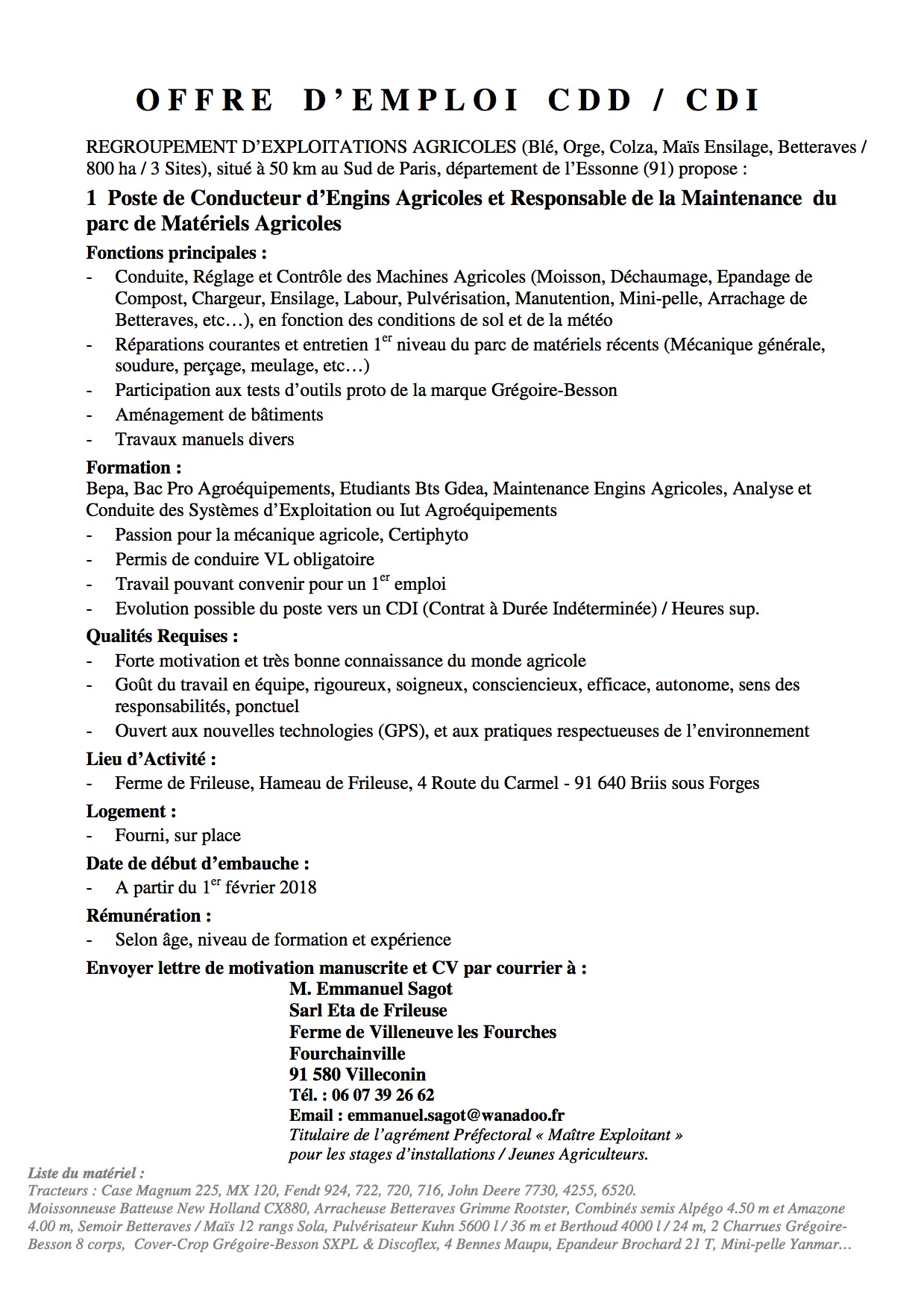 Je vous fais suivre une offre d'emploi pour un poste de conducteur d'engins agricole et responsable de la maintenance du parc de matériels agricole situé dans le département de l'Essonne (91).