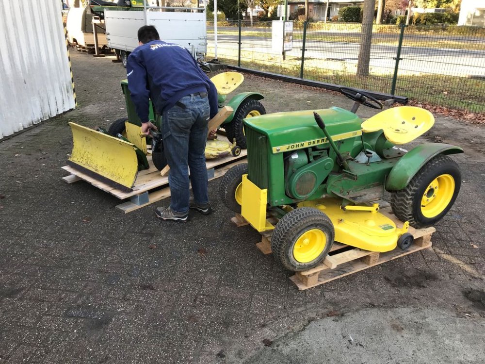 #1Bon ben c'est reparti... après le Panther, j'ai fait dans la miniaturisation, en fait, comme je viens d'avoir un petit Auguste, je me suis dis qu'il fallait que je lui trouve un truc sympa pour s'amuser quand il aura l'age... (ca, c'est la version pour la maman.., en fait ca faisait un moment que j'adorais les premiers Jonjon lawn mower et que je voulais en trouver un.. bref...). John deere a sortie son premier tracteur tondeuse en 1963, le 110 "round fender" (ailes rondes), ils ont une gueule terrible avec leurs calandres longues, le capot chapeau de gendarme, un vrai petit 5020 , et que de la bonne ferraille. A partir de 1969, les RF ont disparu pour laisser place aux SF (square fender) qui ont adopté les ailes carrées monobloc englobant marches pieds et partie centrale ainsi qu'un capot carré comme ceux que l'on connait aujourd'hui, nettement moins beaux. A ma connaissance les RF n'ont pas été importé en Europe, ils sont très rares et importés des US. Il y'a eu des 110 et 112 SF en France importés par le réseau dans les années 70 mais pas de RF . J'ai donc récupéré ce 110 de 1965 chez un importateur hollandais pour un prix aprement négocié (il ya un business énorme sur ces RF meme aux US pour la collection) . Il est en état assez correct, le moteur pète, evidemment après 54 ans y'a quand meme un sacré paquet de rouille partout, je m'y attendais.. Le reportage sera assez court, désolé, j'ai bricolé ca chez moi à l'arrache et pas fait beaucoup de photos...
