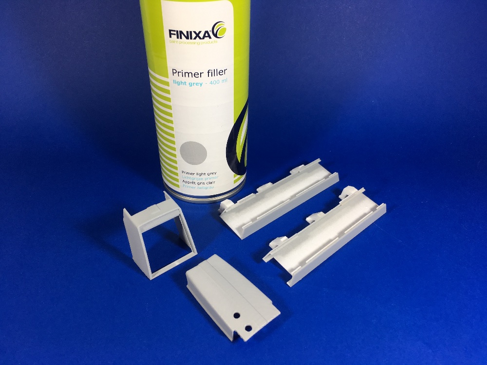 En discutant avec un ami designer, habitué à ce genre d'exercice, j'opte pour un mastic liquide en bombe de la marque FINIXA. C'est pratique car ça se pulvérise facilement, et il suffit de bien jauger l'épaisseur que les pièces est capable de supporter ... La sanction de toute approximation ou tout excès sera les coulures et l'accumulation du produit dans les creux plutôt que sur les arêtes