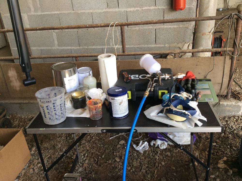 Préparation de la peinture (laque, durcisseur, diluant), réglages et essais du pistolet sur un carton et c'est parti !!!