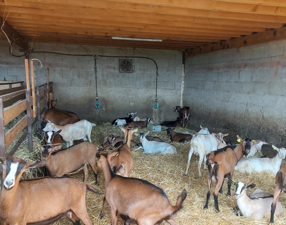 Pour les chèvres une partie de celle-ci sont tarie pour mettre bas autour du 15 septembre avec une reproduction à 94% de réussite. Et une partie est en lactation long 1 tiers .