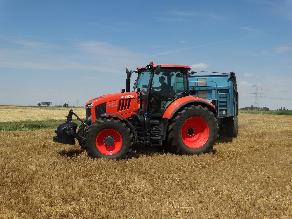 On retrouve une Claas Lexion 760 en 9m30 et aux benne un kubota M7171 et une Maupu 3 essieux ainsi qu'un John Deere 7920 et une Maupu 2 essieux