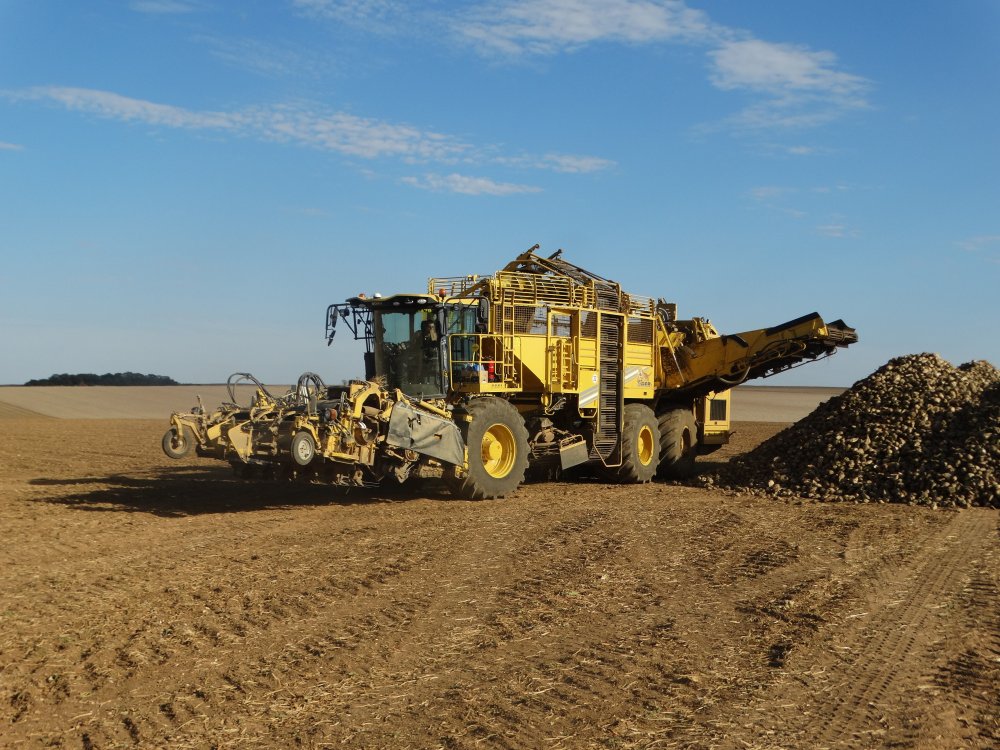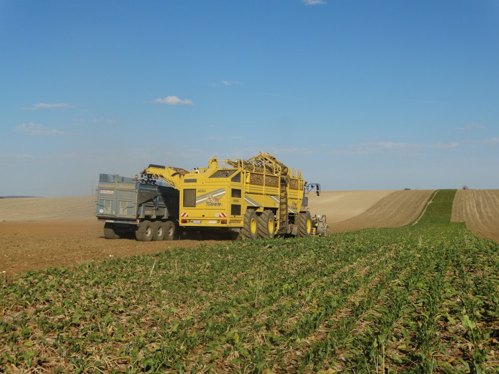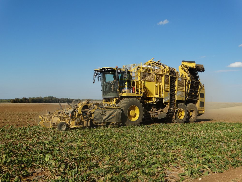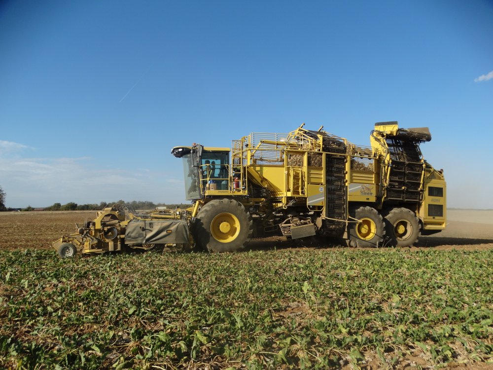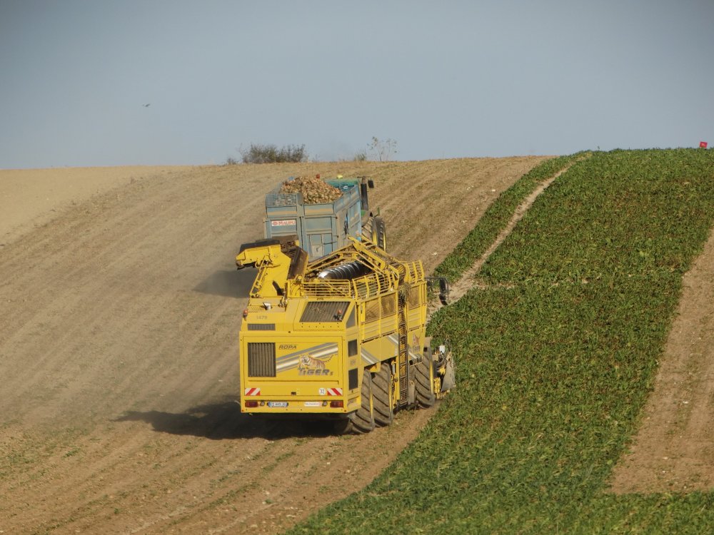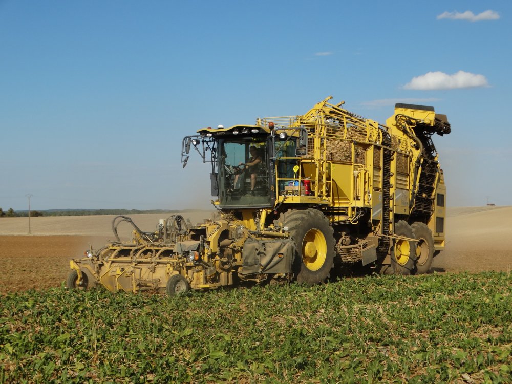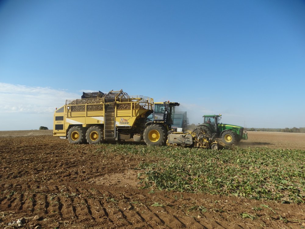 Dernier chantier d'arrachage de betteraves aperçu pour 2018, toujours dans la poussière. On retrouve un Matrot M41 accompagnée d'un Duo de MF / Maupu <ok>