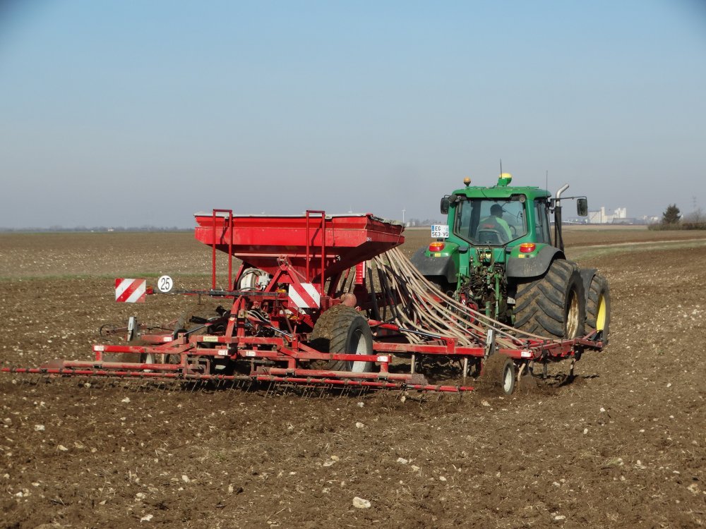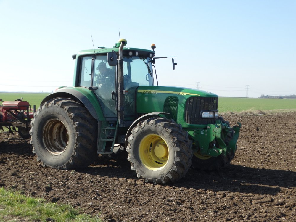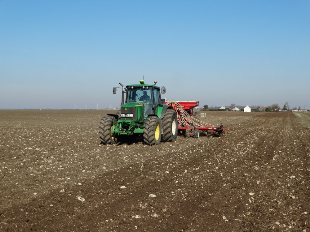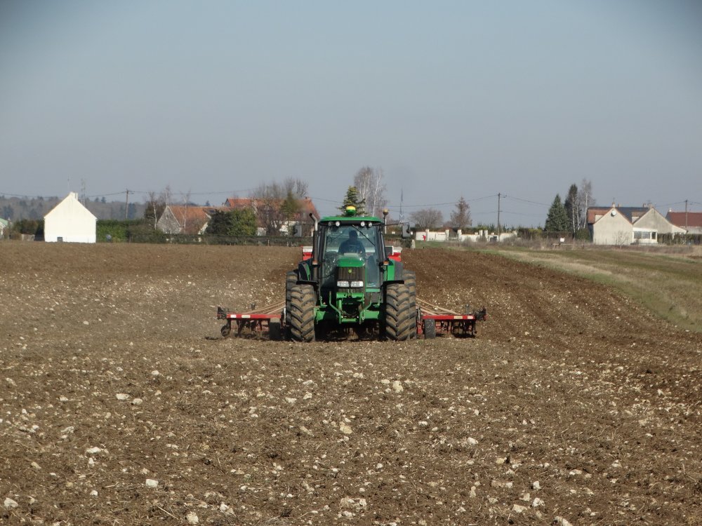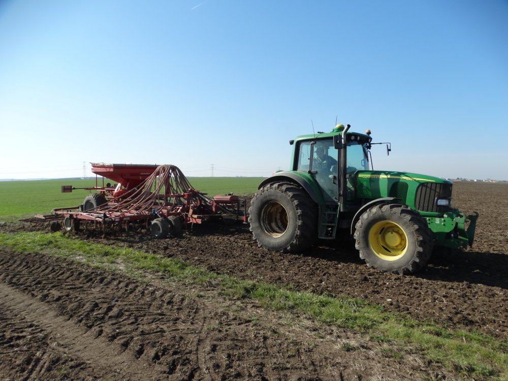 Semis dans l'Aube au printemps avec un John Deere 6210R et un semoir Sky MaxiDrill 6m <ok>