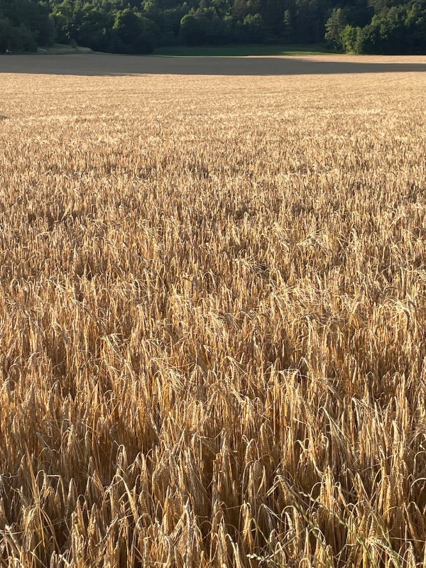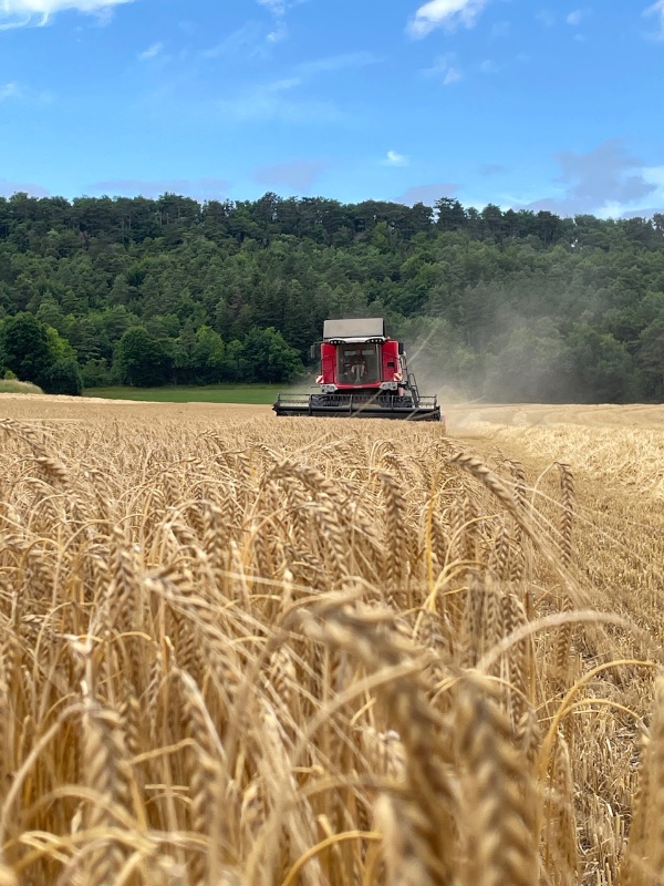 Pour l’instant ça se passe bien, ça mûrissait tranquillement jusque ici, ça risque de s’accélérer vu les conditions météo ! Pour l’instant, on a récolté seulement les orges d’hiver fourragères, on avoisine les 75q/ha. Très correct vu les conditions d’implantation de l’automne 24