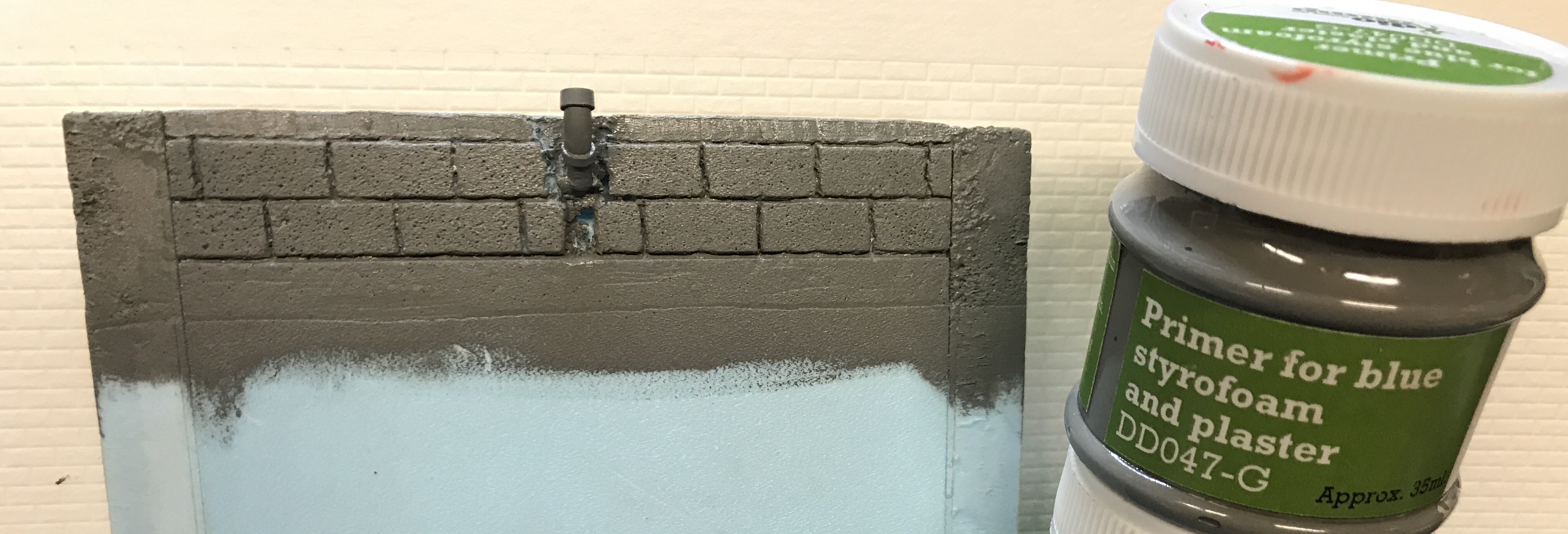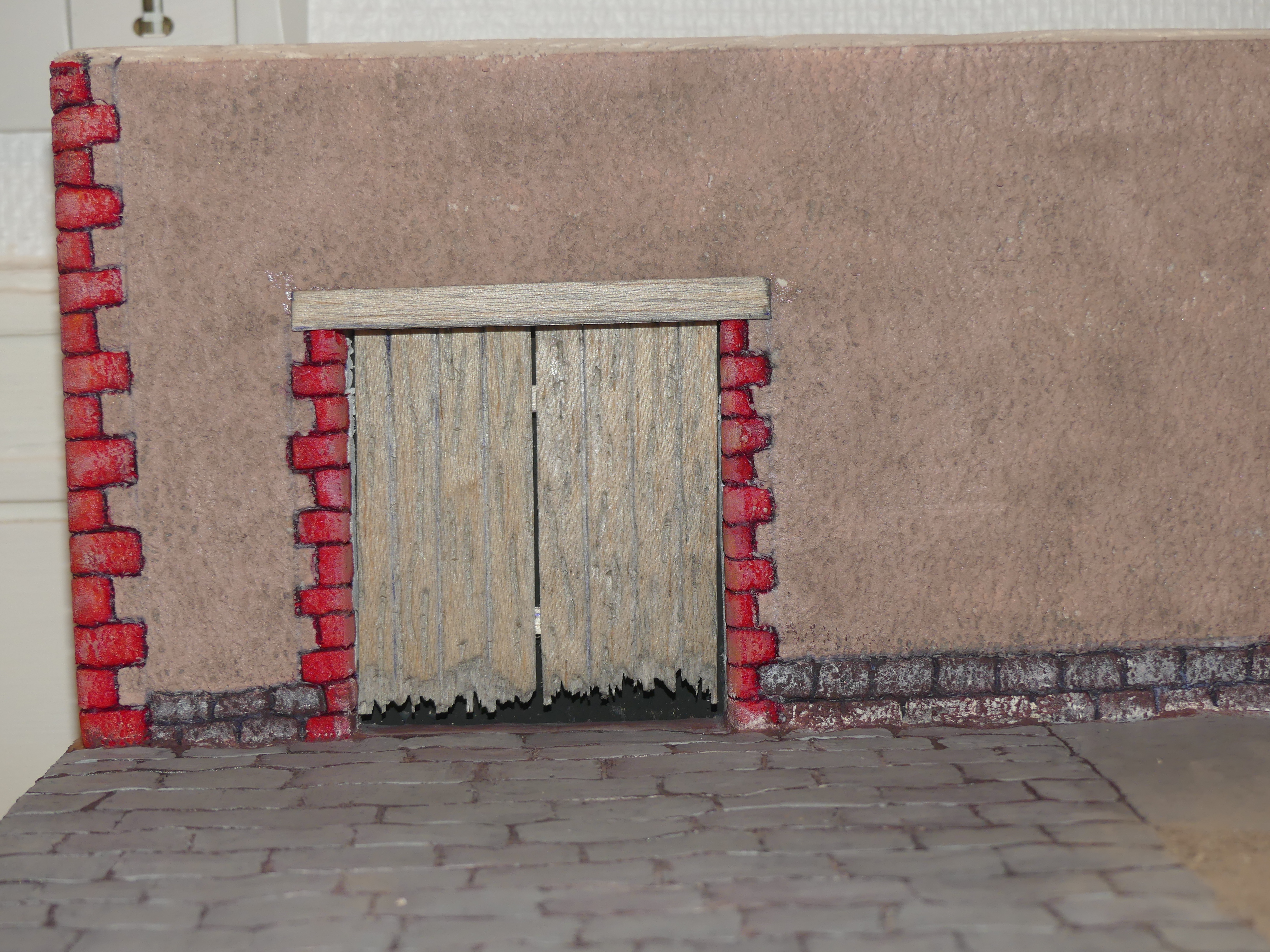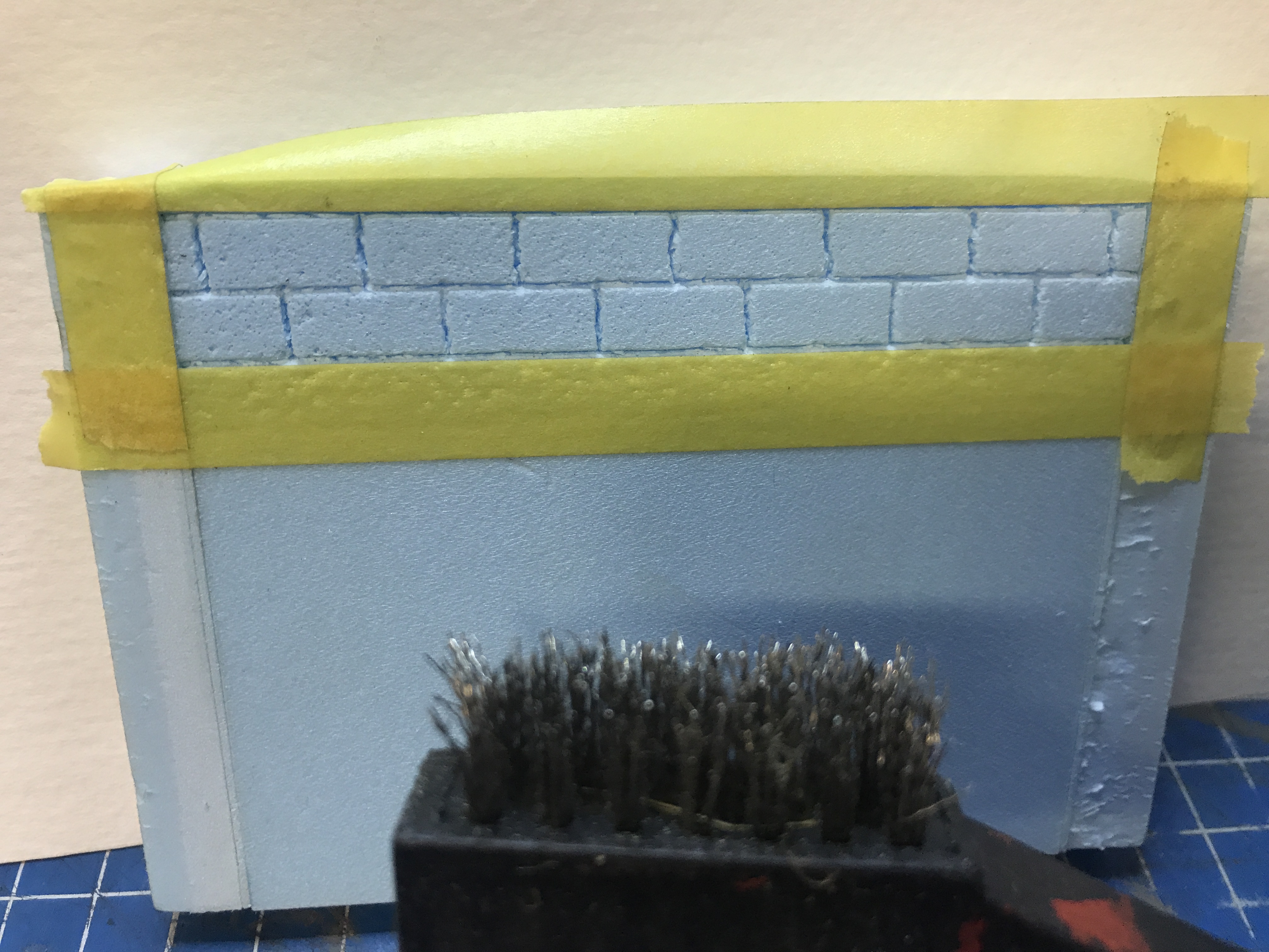 Troisième étape: je masque autour des moellons et je tapote Avec brosse métallique pour créer l'aspect dû moellons
