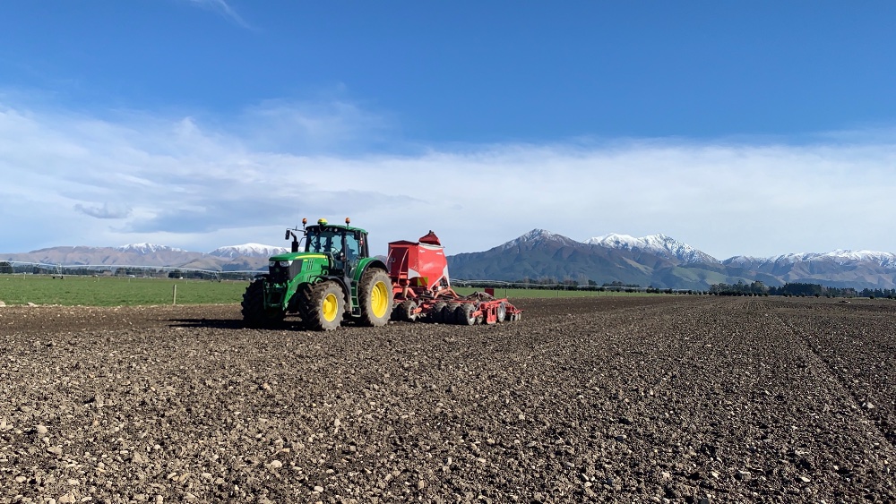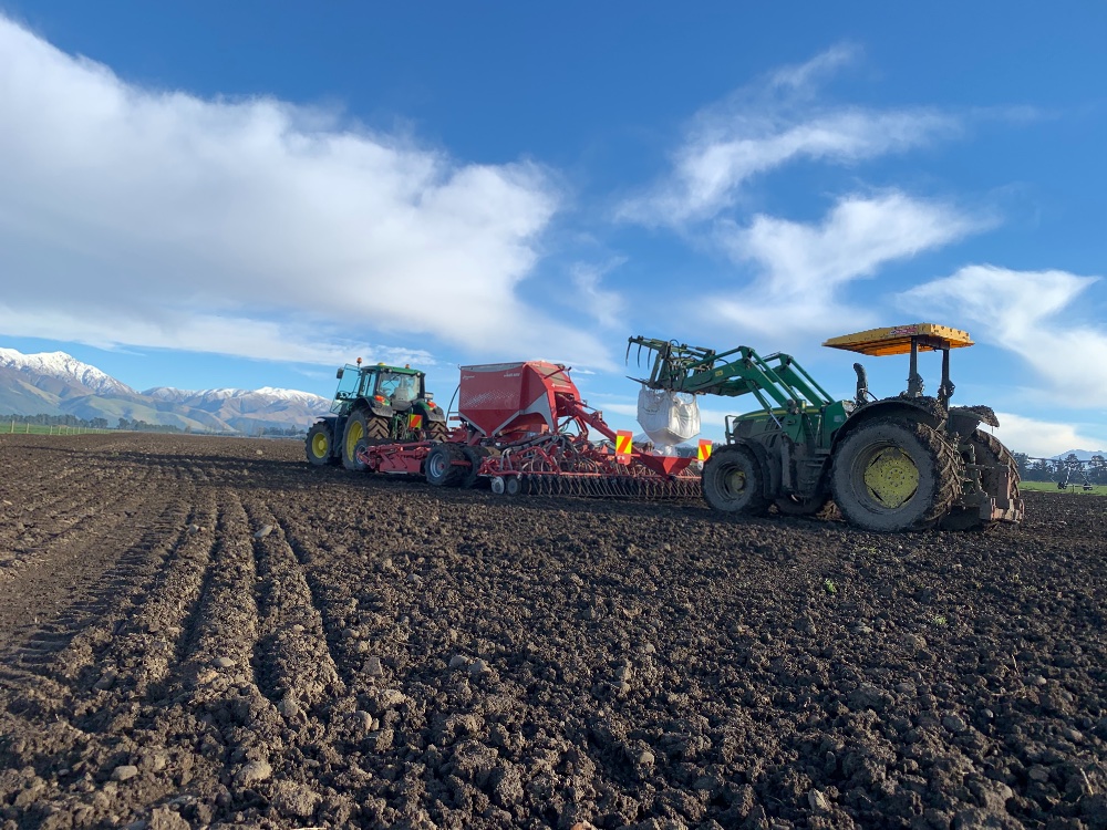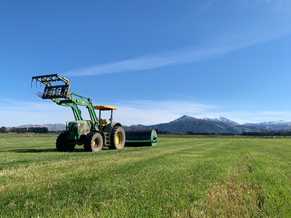 En ce moment, dans la région de Canterbury en Nouvelle Zélande : passage du rouleau dans des paddocks fraîchement fauché dans le but d’enterrer les pierres et permettre une meilleure levée de l’herbe, puis semis d’avoine.