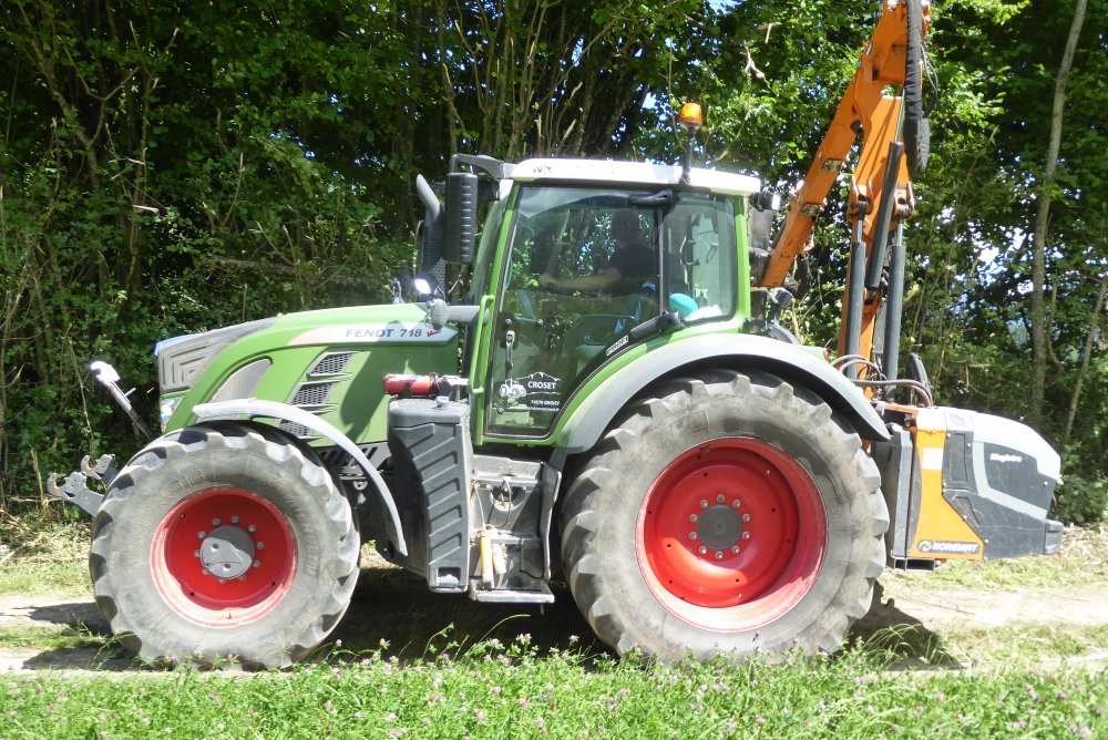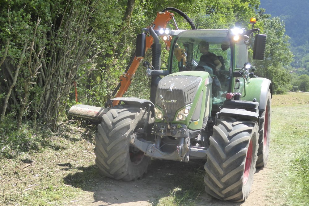 Bonjour. Cet après-midi, autour du lac d'ANNECY, opération taille de haies à la demande d'un client privé. Pour cela, voici un FENDT 718 VARIO avec épareuse NOREMAT MAGISTRA.