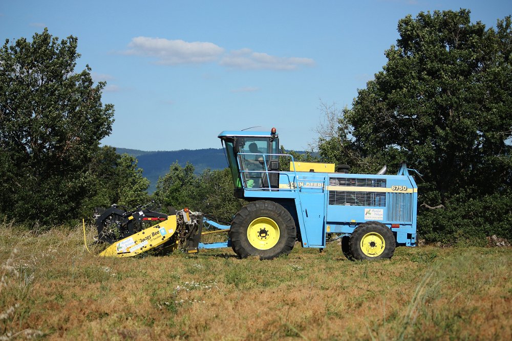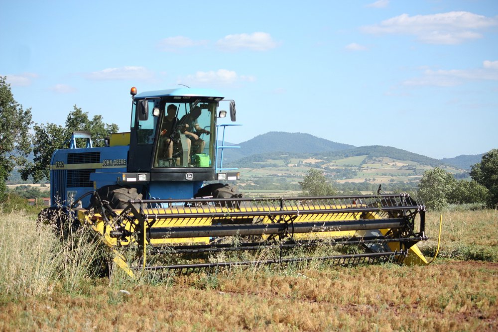 #131Mise en andains d'une culture de lentilles Aop lentilles verte du Puy. Ancienne ensileuse reconvertie en automoteur avec une coupe HonneyBee