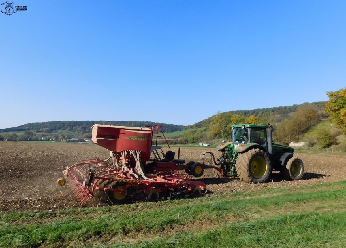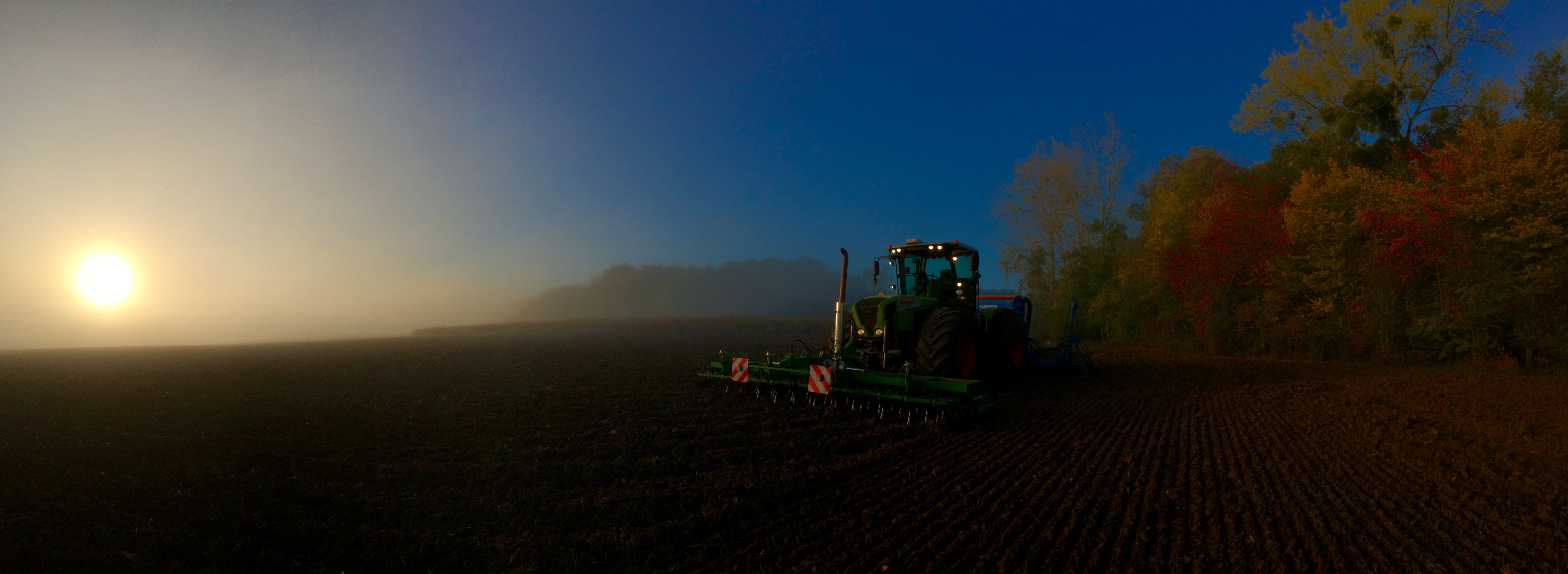 Retour lors d'une fin de journée automnale avec un essais d'un semoir KUHN Espro 6000 Rc de démo attelé à un John Deere 8370R.