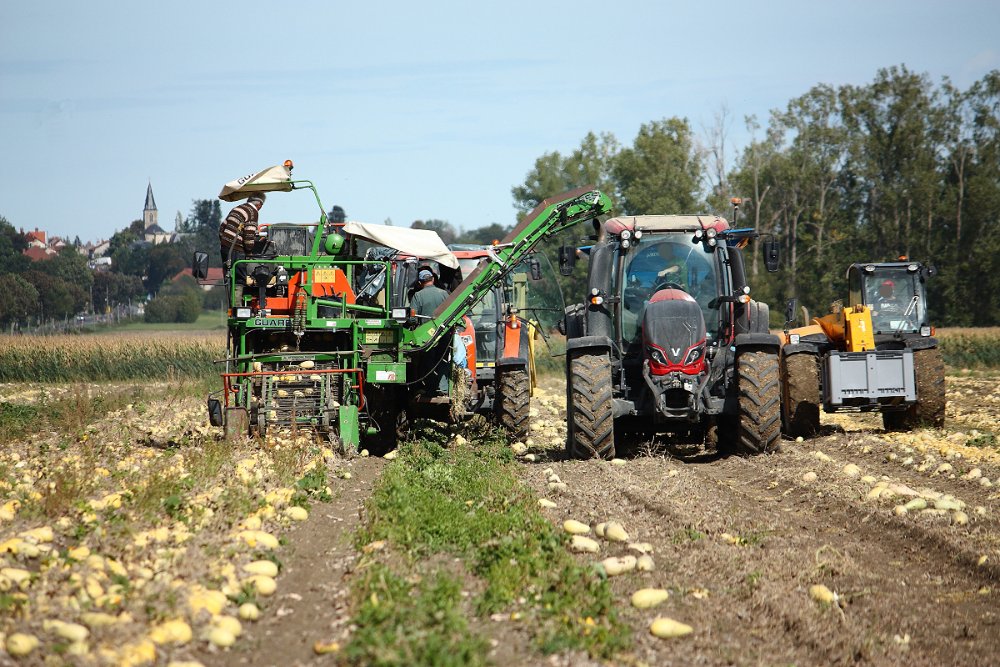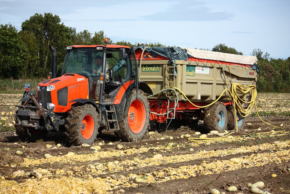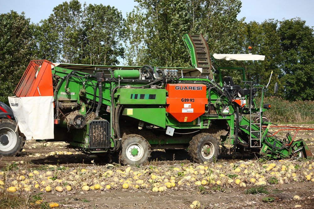 *Ramasseuse à tomate modifiée qui sert aussi de table de triage pour séparer les courges issues du croisement souhaité avec celles autofécondées.
