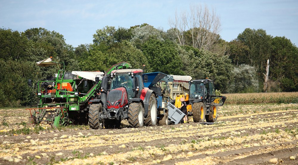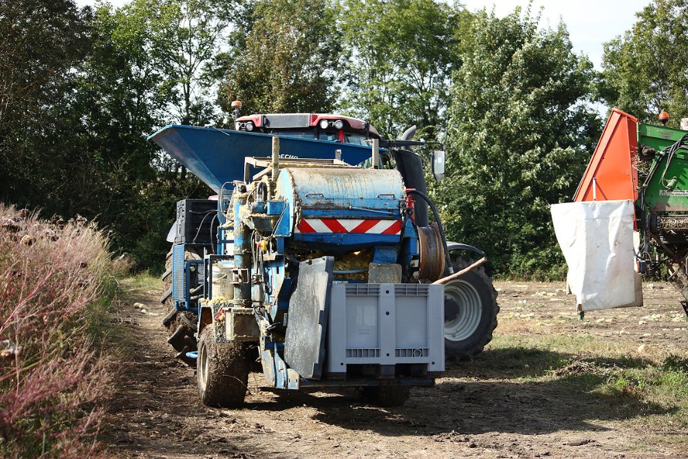 *La machine bleue attelée au Valtra qui broie et trie les graines aidée avec de l'eau. Les graines tombant dans une caisse.