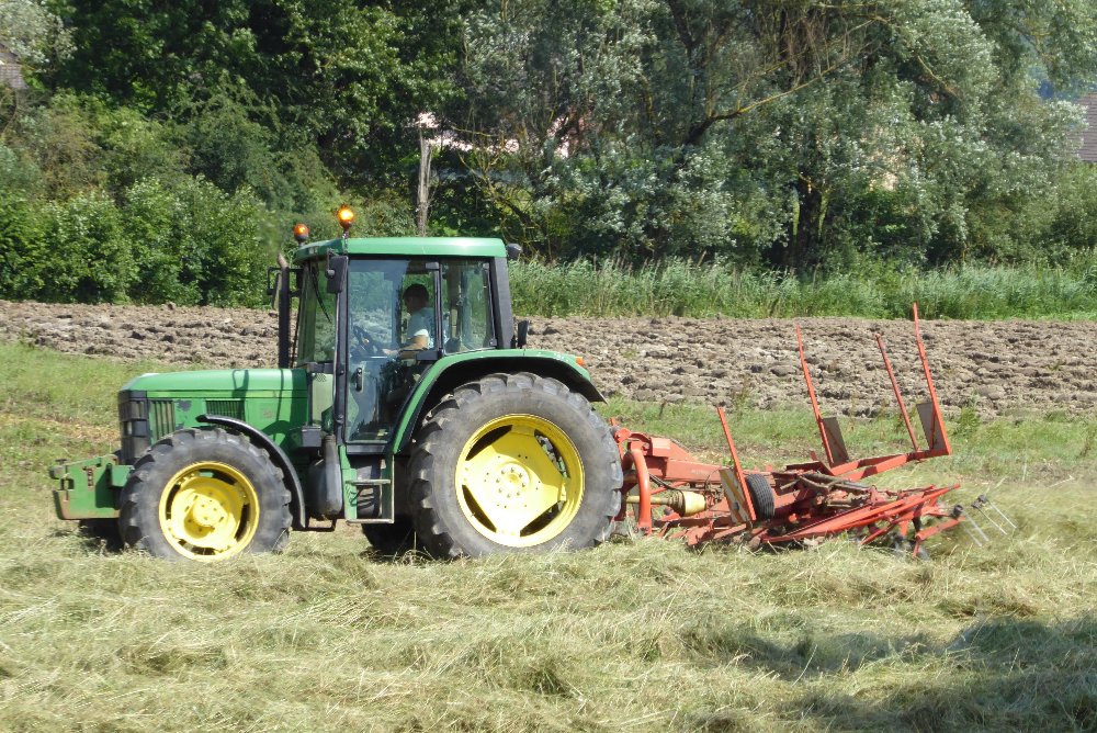 Un JOHN DEERE 6210 et une faneuse KUHN GF 6401. Merci au conducteur.