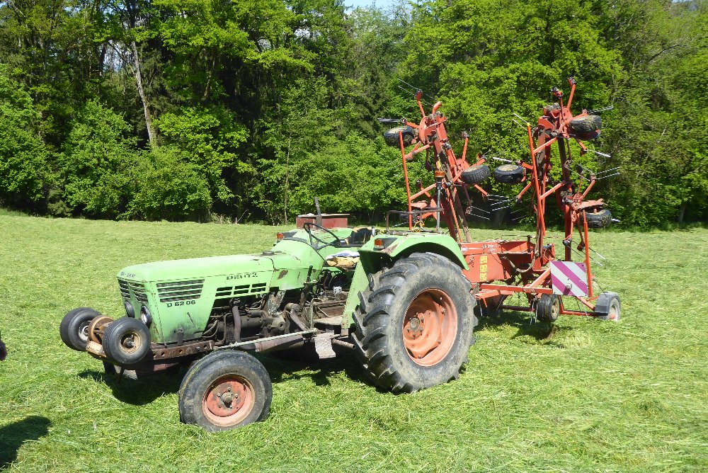Beau combiné tracteur-faneuse ! A quoi servent les 2 petites roues à l'avant du Deutz ?