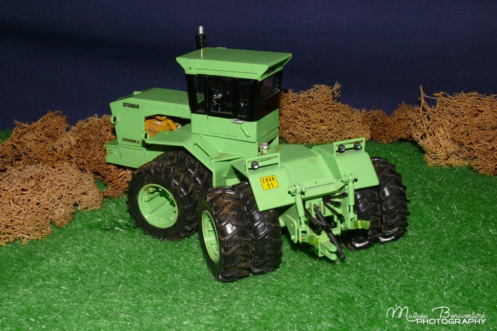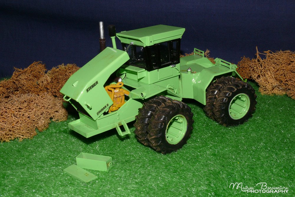 Frédéric, alias Tracknet65 m'avait passé quelques photos d'un superbe (mais fané) Steiger Cougar II dans la région de l'Armagnac, jumelé à l'arrière et qui il y a une quinzaine d'années tournait encore. J'ai donc reproduit la bête jusqu'à sa boîte à outils (supprimée ensuite) en me calquant sur les modèles ERTL.