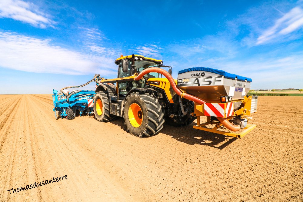 JCB Fastrac 4220 avec une trémie Alpégo et un semoir Monoem pneumatique 12 rangs