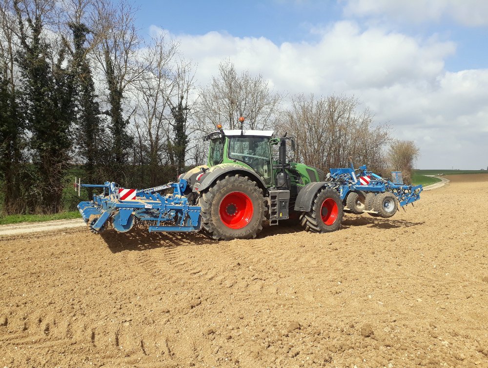 On y retrouve le plus ancien des deux Fendt 824 S4 de la ferme, attelé a un tasse avant et a un Comdor Religieux Frères, le tout en 4 mètres.
