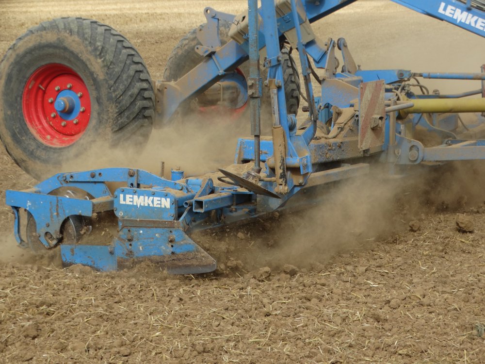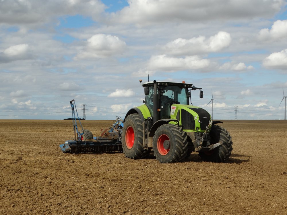 #391Préparation des terres en vu des semis de colza en Août dernier. Au programme Claas Axion 920 et rotative Lemken 6m semis portée