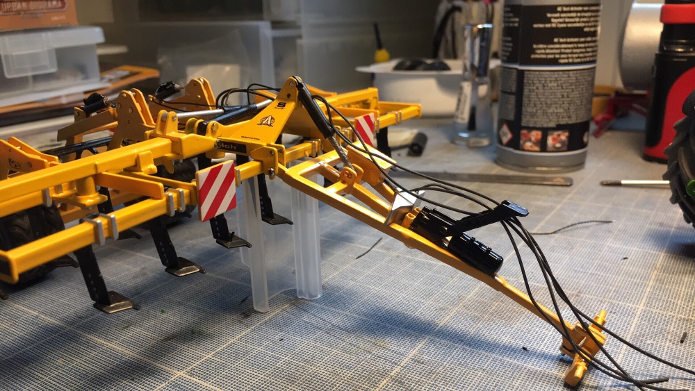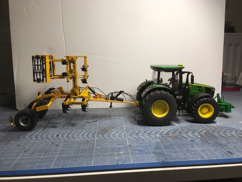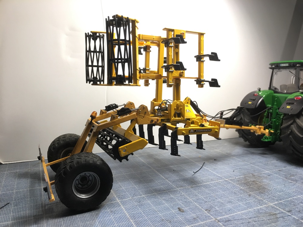 Donc teparation de fortune quelques petites bricoles par ci par la ! Une peinture soit disant jaune agrisem alors je sais qui a le bon « ma bombe ou Replicagri (monocle) ). Wles roues final proviennent de chez Minitoys je crois que c est des roues de presse Claas Quadran UH.
