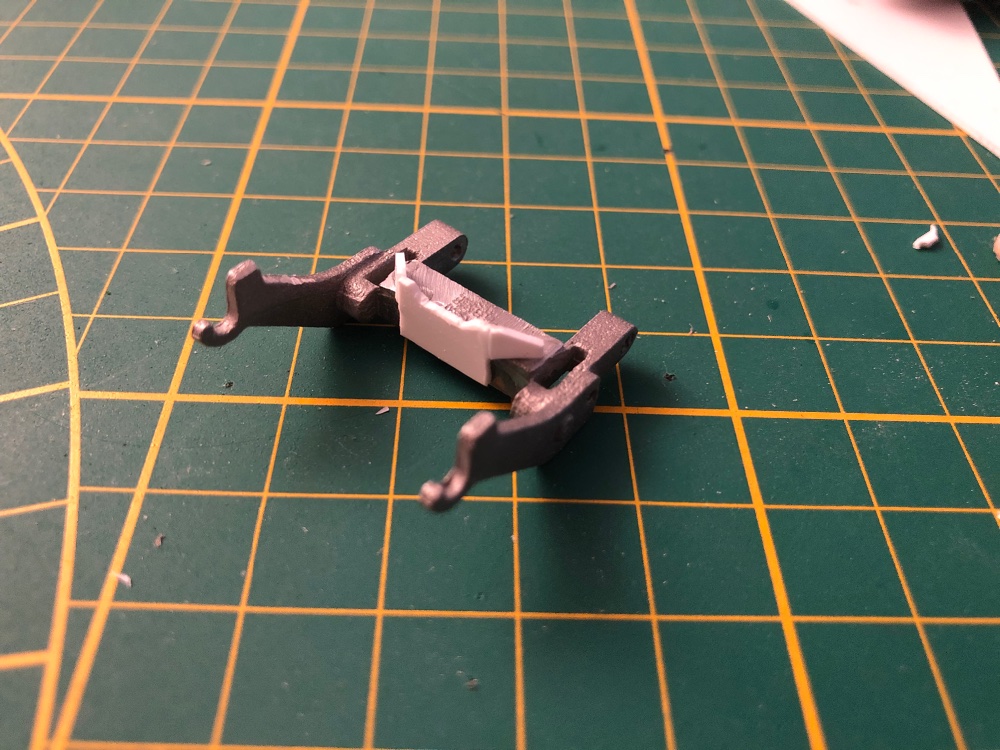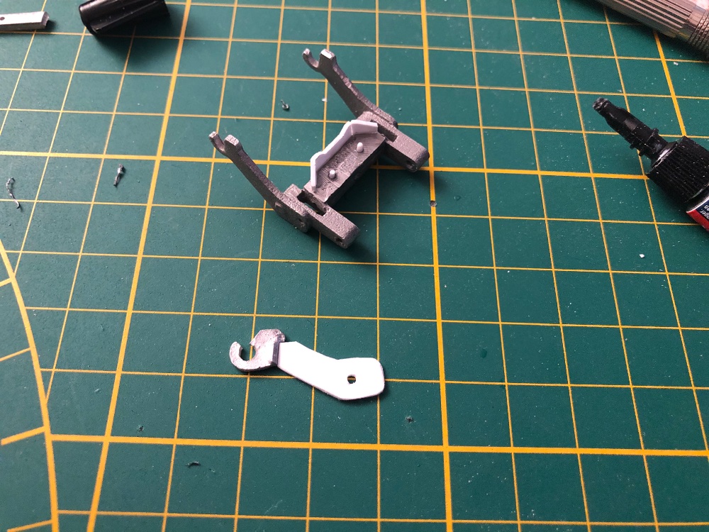 Pas mal de travail là dessus pour arriver à quelque chose de plus fin, j’ai carrément attaqué à la meuleuse pour évidé la partie entre les bras puis avec le disque du dremel pour finir avec une fraise et la lime...