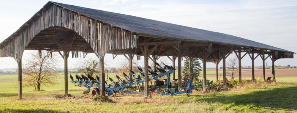 Voici une petite photo d'un des bâtiments dont je me suis inspiré. C'est typique de ma région, avec le matériel qui va avec telle la charrue 12 corps. On retrouve beaucoup de bâtiments excentrés des corps de fermes et des villages servant uniquement à mettre le matériel à l'abri et c'est ce que j'ai voulu faire avec mon diorama.