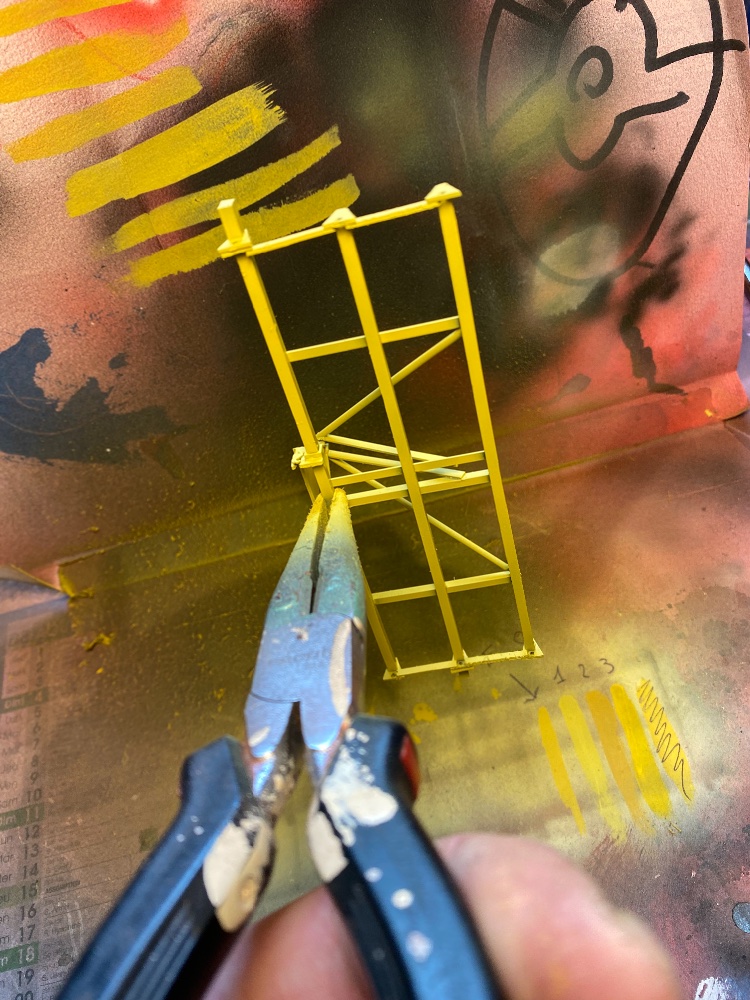 Mise en peinture avec une peinture maison en mélangeant 3 teinte de jaune Mig. J’ai tenté une peunture zénithal je sais pas si cela a marché difficile de voir quelques choses sur du carré de 3x3 ! On verra pour un autre projet un jour !